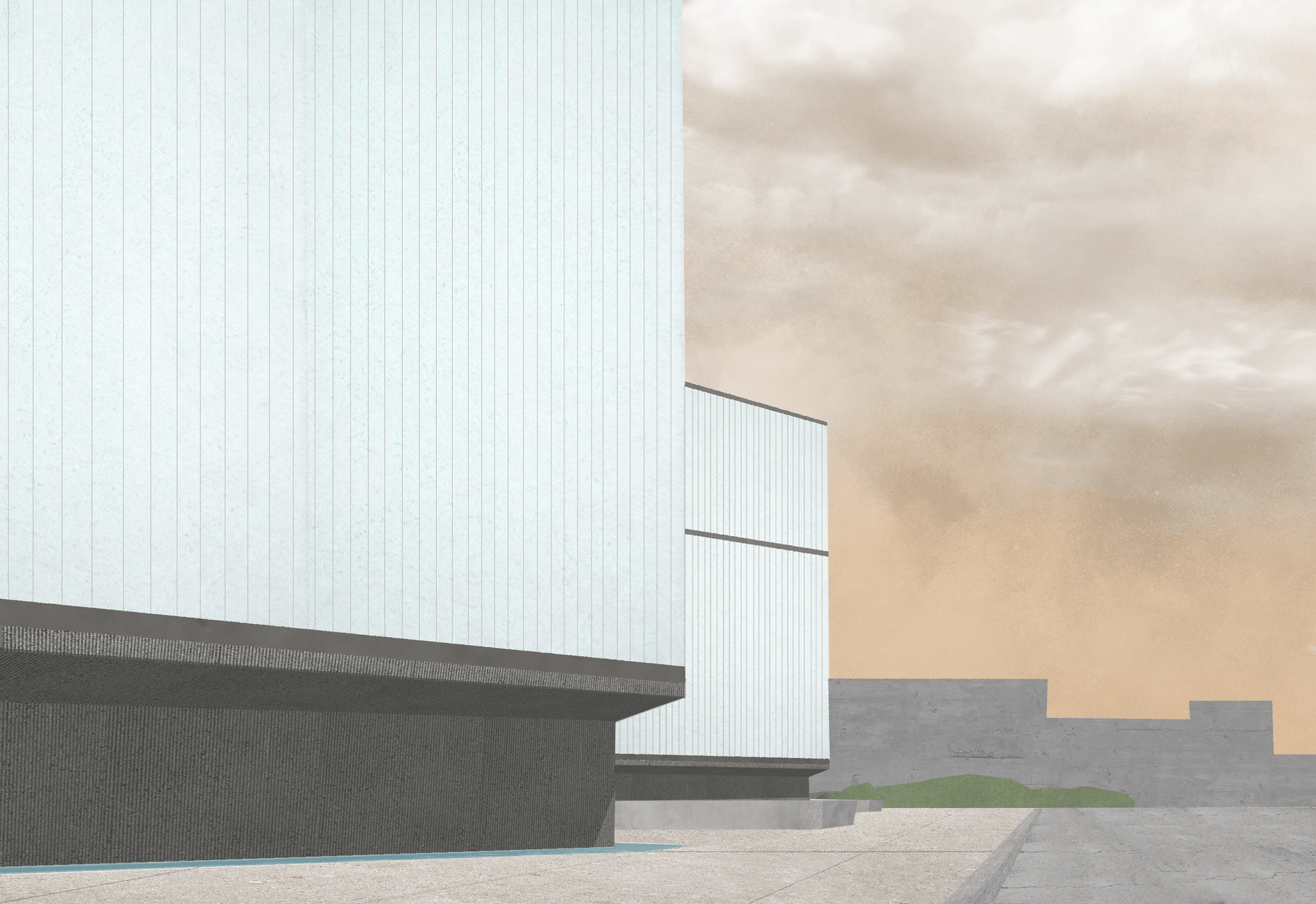 Channeled comes from a conceptual contemporary museum where channeled glass was modeled as the primary facade component. Concrete is the secondary material, seen at the base of the channeled glass. The contrast of the two materials is intentionally emphasized. The base of the image is rugged, urban and gritty. The middle and height of the image is polished, smooth and milky. The glass floats and the concrete sinks.