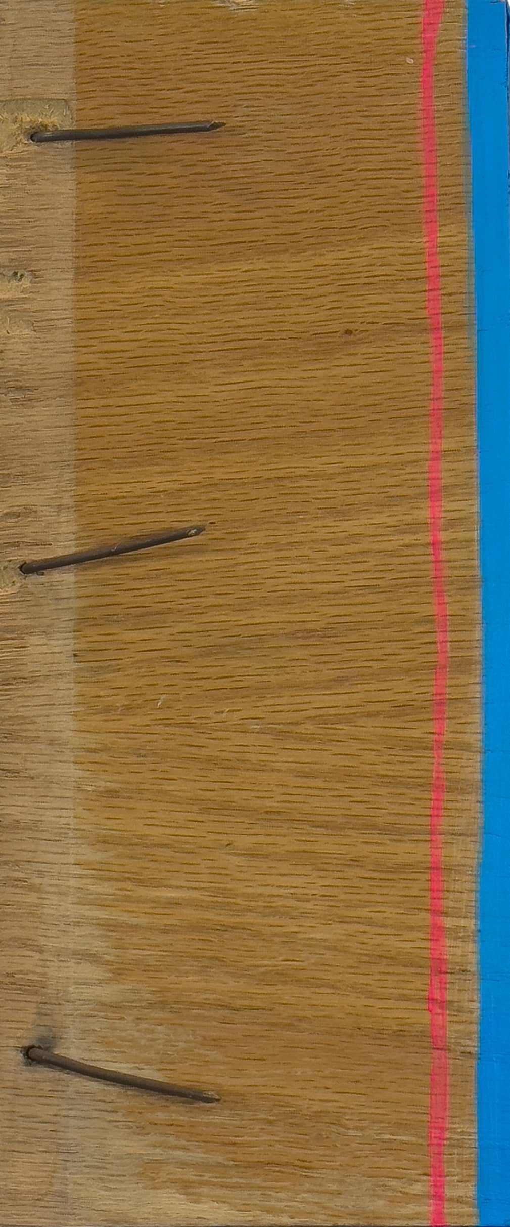 This piece features a solid wood base with a warmer tone wood veneer applied. To the left of the piece there is a residue and clues of distress from something that may have been applied to the surface before. 3 bent nails are placed evenly along the length of the piece. The right side balances the piece by introducing a thin neon pink strip and a wider electric blue strip that wraps the side.