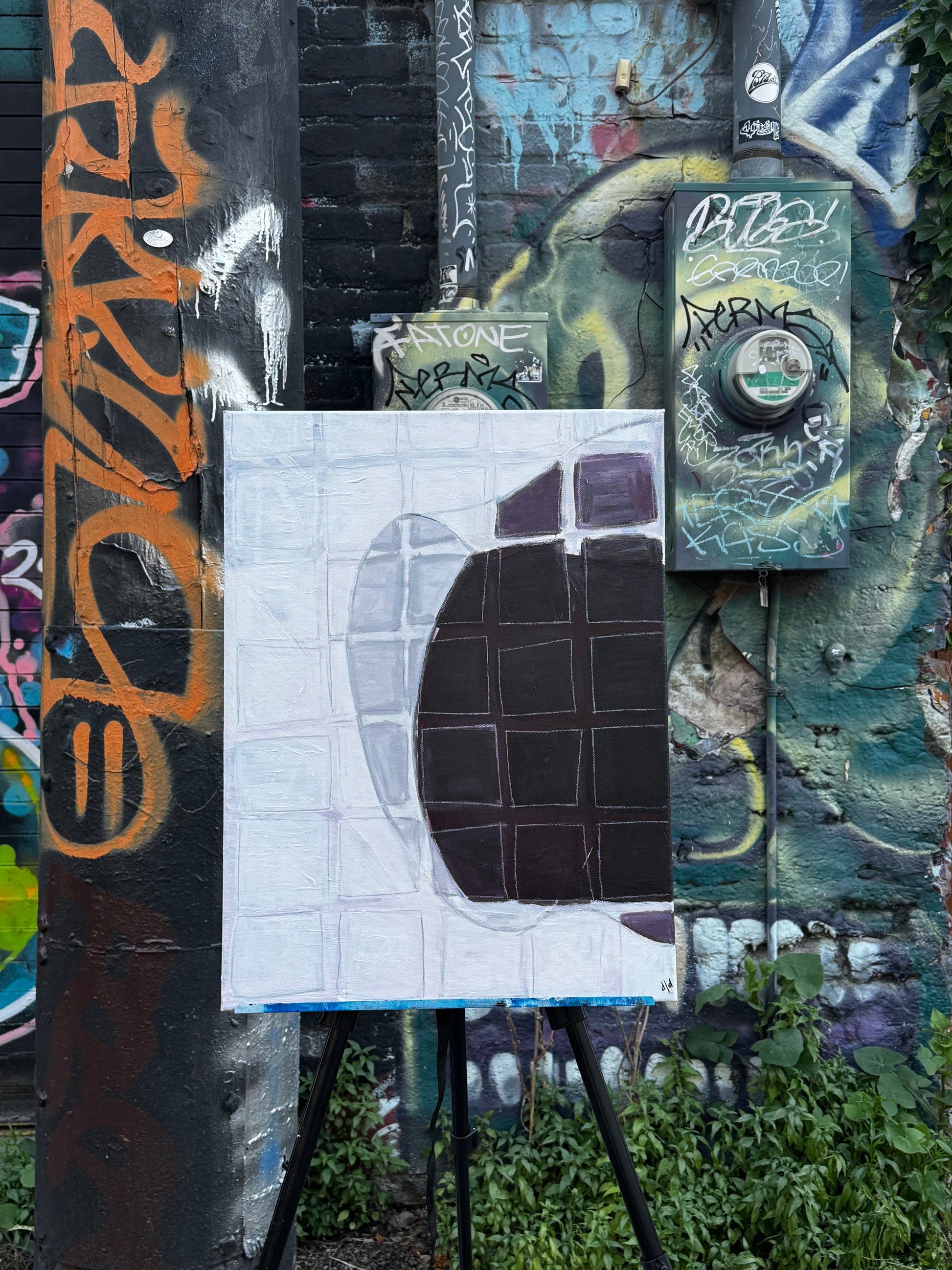 The first phase featured a more detailed wine glass that showcased parts of the glass and wine itself in an abstract manner. Within the second phase, the only remaining element of phase 1 is the general body of the wine glass and the wine itself. The piece intentionally makes it hard to see the glass and wine in its literal sense but leaves just enough detail that emulates a wine glass and allows the viewer to make that connection on their own. The piece is then segmented into a 5x7 grid where color and definition are forced into a pattern. Some squares contain glass, wine, or both, while other just contain the background with the grid.